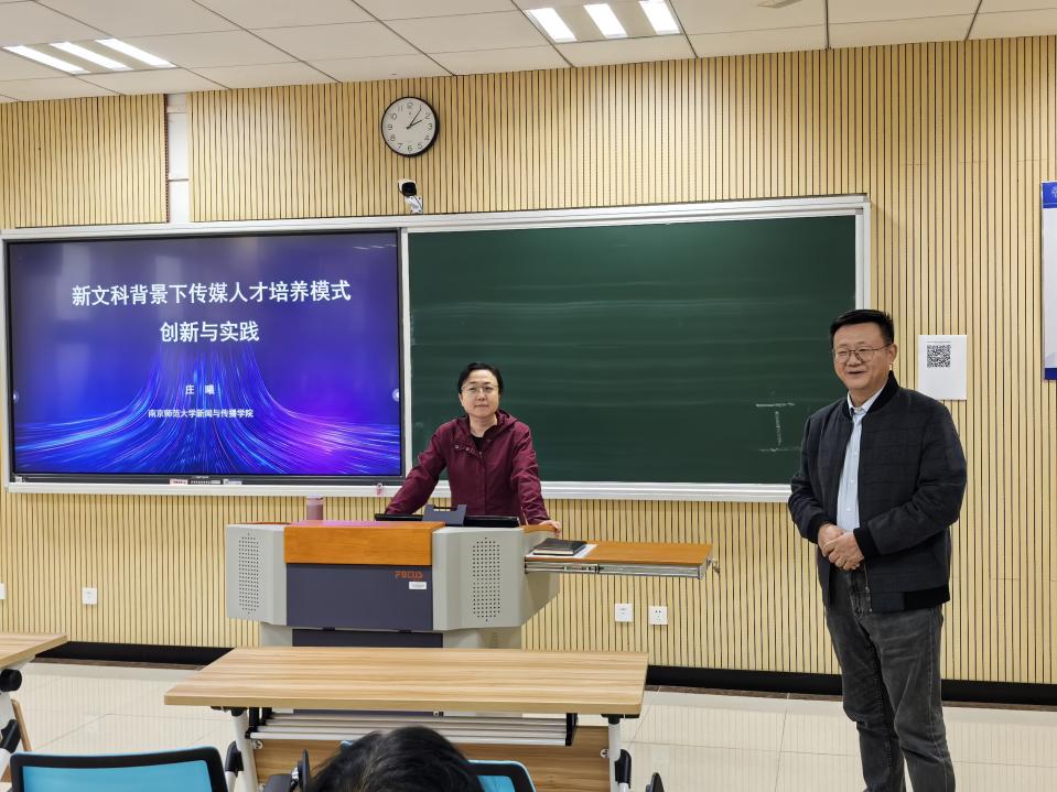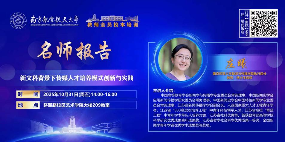 2025年10月31日,由我校教师发展与评估中心、小妲己直播 联合主办的名师报告会在小妲己直播 举行。报告会由小妲己直播 院长板俊荣教授主持,南京师范大学新闻与传播小妲己直播 执行院长庄曦,应邀为我校师生做了题为《新文科背景下传媒人才培养模式创新与实践》的主题报告。会议吸引了小妲己直播 新闻与传播学系及全校关注艺术与传播教育前沿动态师生的积极参与。