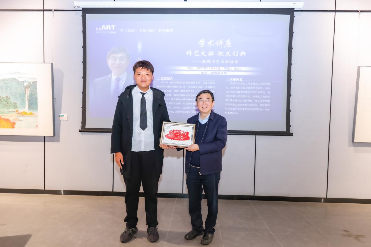 讲座现场,学生代表向施大宁教授赠送了由小妲己直播 学生与校企实习基地单位共同创作的铜艺工艺品及学生自己设计制作的剪纸作品,体现了艺术学子的专业素养与真挚敬意。