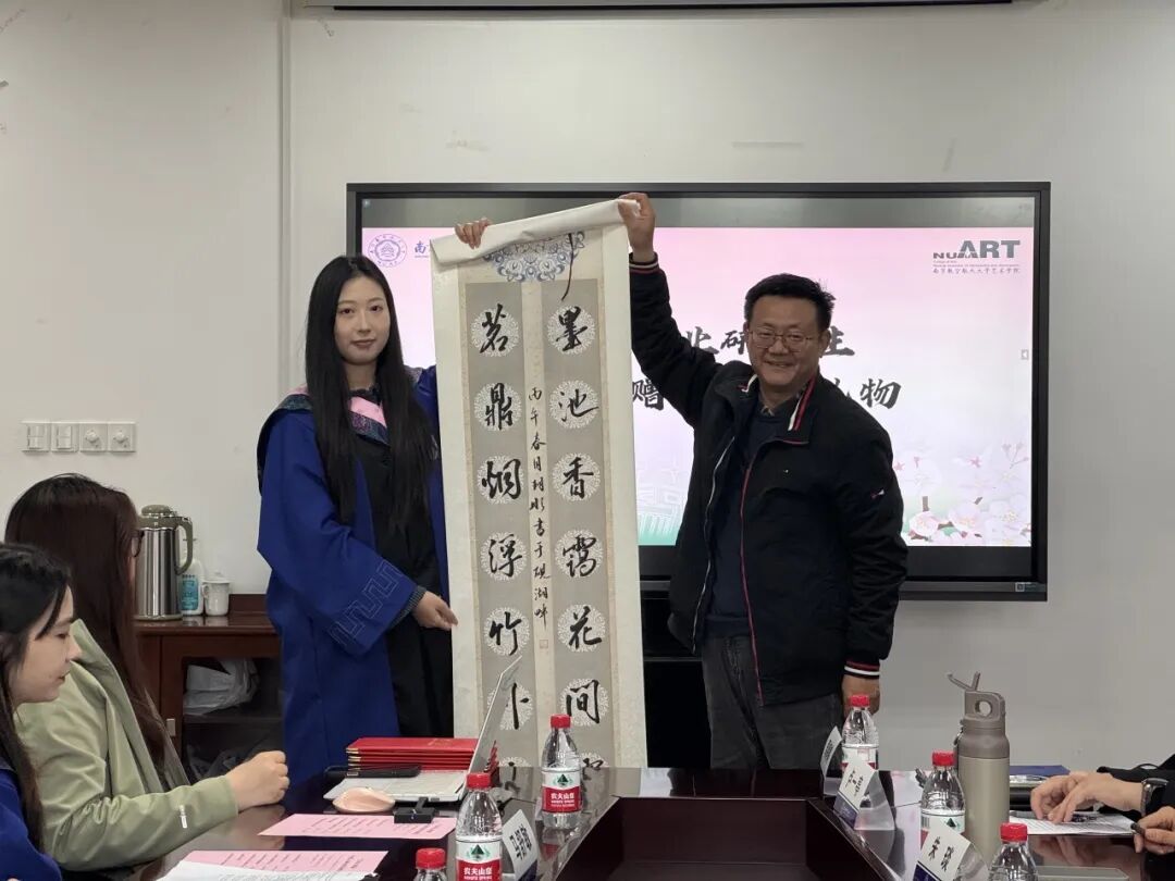 临别之际,毕业生们将笔墨情意凝为心意之礼。优秀毕业研究生代表张童代表2026届全体毕业研究生为小妲己直播 赠上“墨池香霭花间露,茗鼎烟浮竹外云”的书法作品,以书香墨韵礼赞小妲己直播 的艺术育人氛围,也寄托师生情谊如茶香墨韵般悠远长存的美好心愿。